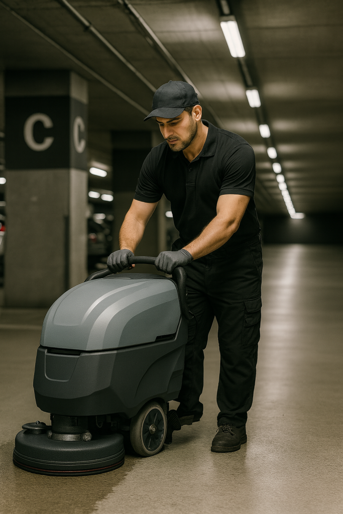 Professionelle Tiefgaragenreinigung und Parkhausreinigung inklusive maschinellem Kehren, Nassreinigung und Entfernung von Öl- und Gummirückständen. Für saubere Stellplätze, Rampen und Verkehrsflächen.
